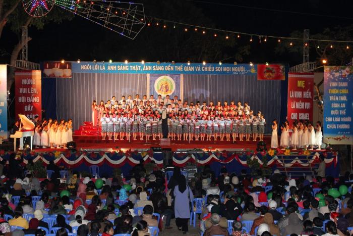 Tiếp theo là các bài dâng hoa được các em thiếu nhi trong Giáo xứ cung kính dâng lên mẹ theo lời ca tiếng nhạc thật nhịp nhàng và trang trọng.