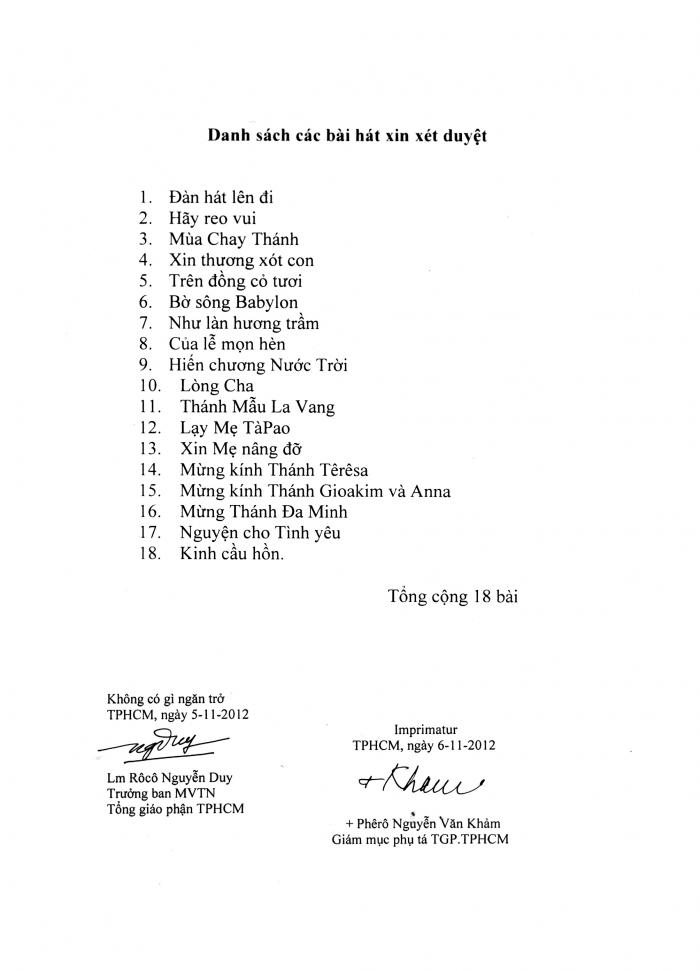 Hôm nay tôi xin được phép tiếp tục gửi lên một số bài hát đã được giáo quyền chuẩn thuận, sửa duyệt và cho phép sử dụng trong phụng vụ. Xin chân thành cảm ơn ! |