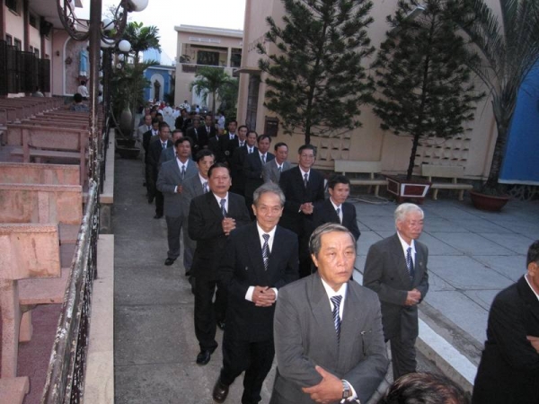 Đoàn đồng tế từ nhà xứ tiến vào nhà thờ một cách trang trọng. Đức Hồng y GB. Phạm Minh Mẫn đã cắt sợi chỉ nhỏ để những trái bong bóng nhiều mầu tung bay lên trời như hòa chung niềm vui của giáo xứ, của mọi người tham dự hôm nay, làm một.