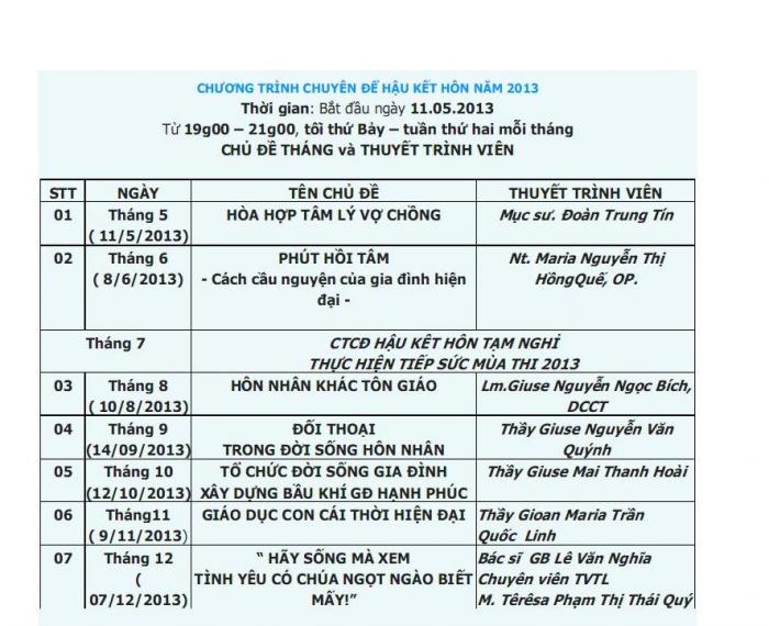 uy nhiên, nếu gia đình nhỏ của các bạn đang không được như vậy, thì các bạn có biết lý do tại sao không? Các bạn có biết làm cách nào để vượt qua hoàn cảnh “cơm không lành, canh không ngọt” của gia đình bạn không? Các bạn có muốn “cứu” ngôi nhà gia đình bạn đang có nguy cơ sụp đổ không? Xin mời bạn hãy đến với chúng tôi trong CHƯƠNG TRÌNH CHUYÊN ĐỀ HẬU HÔN NHÂN.