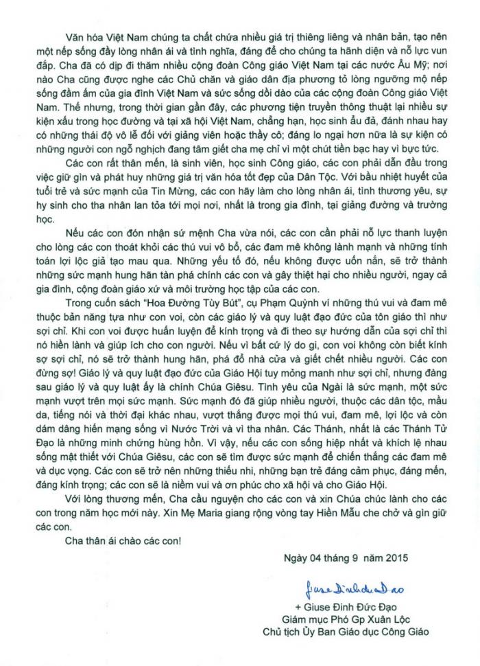 Uỷ ban Giáo dục Công giáo: Thư gửi các sinh viên, học sinh Công giáo dịp đầu năm học 2015-2016